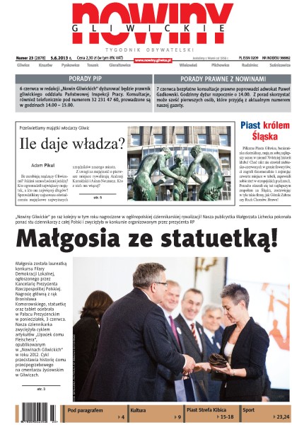 Ile zarabiają rządzący Gliwicami, kto zgromadził największy majątek, a kto ma najwięcej długów; publicystka „Nowin Gliwickich”, Małgorzara Lichecka została laureatką konkursu Filary Demokracji Lokalnej, ogłoszonego przez Kancelarię Prezydenta Rzeczpospolitej Polskiej; mija rok, odkąd eksmisja na bruk przestała być tylko straszakiem – jak chętnie Gliwice korzystają z tego rozwiązania.