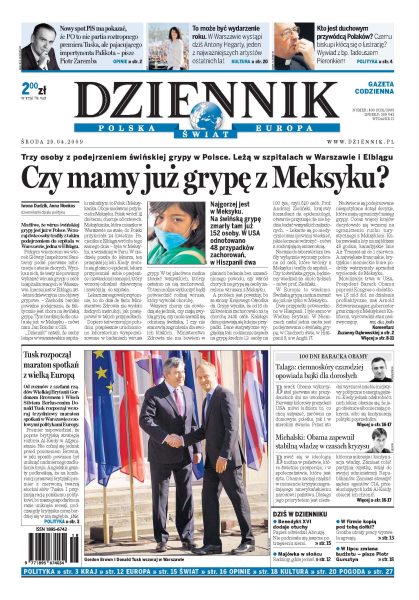 Trzy osoby z podejrzeniem świńskiej grypy w Polsce; jednego dnia Donald Tusk gościł dwóch premierów – Wielkiej Brytanii i Włoch; Palikot płaci partii Kaczyńskiego 5 tys. zł za spot o sobie; sędzia Fronczyk jest bezpardonowo atakowana przez polityków partii Jarosława Kaczyńskiego; Cimoszewicz traci punkty w Radzie Europy; groźba utraty pracy wyzwala w ludziach najgorsze instynkty; homoseksualiści szukają partnerki, by stworzyć pozory tradycyjnego związku; papież odwiedził wczoraj Abruzję, która nie podniosła się jeszcze po tragicznym trzęsieniu ziemi. Dodatki: The Wall Street Journal, Warszawa.