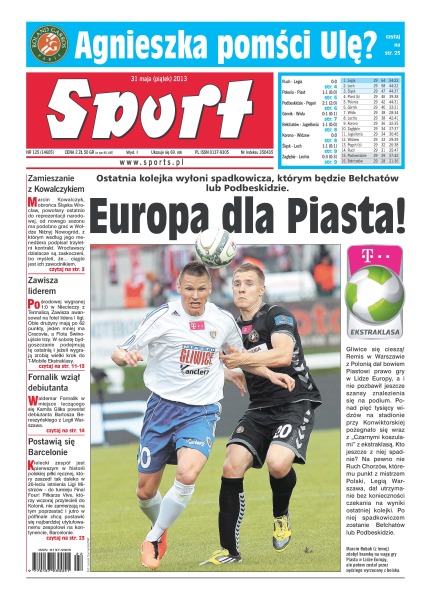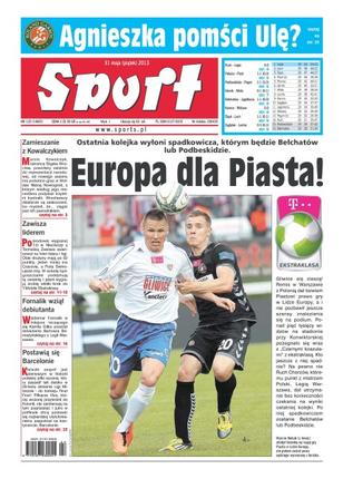 Europa dla Piasta – ostatnia kolejka wyłoni spadkowicza, którym będzie Bełchatów lub Podbeskidzie; czy Agnieszka pomści Ulę; zamieszanie z Kowalczykiem – Marcin Kowalczyk, obrońca Śląska Wrocław, powołany ostatnio do reprezentacji narodowej, od nowego sezonu ma podobno grać w Wołdze Niżnyj Nowogród, z którym według jego menedżera podpisał trzyletni kontrakt; Zawisza liderem – po środowej wygranej 1-0 w Niecieczy z Termalicą Zawisza awansował na fotel lidera I ligi; Fornalik wziął debiutanta – Waldemar Fornalik w miejsce leczącego się Kamila Glika powołał debiutanta Bartosza Bereszyńskiego z Legii Warszawa; postawią się Barcelonie – kielecki zespół jest pierwszym w historii polskiej piłki ręcznej, który zaszedł tak daleko w 20-leciu istnienia Ligi Mistrzów - do turnieju Final Four.