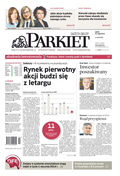 Rynek pierwotny akcji budzi się z letargu – w oczekiwaniu na prezentacje; jakie akcje kupiłaby piękniejsza strona naszego rynku; fuzje i przejęcia – warunki zakupu Mediatela przez Hawe okazały się korzystne dla inwestorów; akademia inwestowania – fundusze, które czerpią zyski z dywidend; Enel-Med – nowa strategia w III kwartale, inwestor poszukiwany; rząd przyspiesza – łupkowe przepisy od 2014 roku; polska gospodarka urosła w I kwartale o 0,5 procent; zmiany w systemie emerytalnym mogą wejść w życie 1 stycznia 2014 roku; Milkiland – ukraińska spółka mleczarska tworzy w Polsce przyczółek do zdobycia rynków Unii; Vantage Development – deweloper planuje emisję obligacji za 30 mln zł; nasza waluta w ciągu dwóch ostatnich dni straciła w relacji do euro 8 groszy; Komisja Europejska chce dać Polsce dodatkowe dwa lata na cięcie deficytu finansów publicznych.