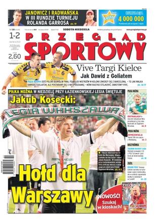 „Hołd dla Warszawy” – Jakub Kosecki – w niedzielę przy Łazienkowskiej Legia świętuje; Janowicz i Radwańska w III rundzie turnieju Rolanda Garrosa; Vive Targi Kielce jak Dawid z Goliatem – dziś polski zespół w Final Four Ligi Mistrzów w Kolonii zmierzy się z Barceloną; pomocnik Sebastian Mila przedłużył o trzy lata kontrakt ze Śląskiem Wrocław; Kamil Glik nie zagra meczu w reprezentacji z Mołdawią; Tauron Basket Liga – Stelmet prowadzi 3-0 z PGE Turowem i jest krok od mistrzostwa Polski; żużlowe Grand Prix – Tomasz Gollob narzeka na tytanowe części motocykla, ale w sobotę zapowiada walkę w zawodach w Cardiff; drugie podejście Mourinho – Jose Mourinho w sobotę po raz ostatni poprowadzi Real – w przyszłym tygodniu znów zostanie trenerem Chelsea.