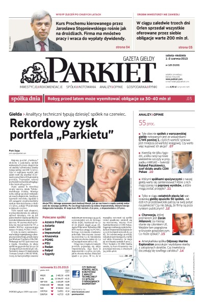 Rekordowy zysk portfela „Parkietu” – analitycy techniczni typują dziesięć spółek na czerwiec; wysyp zleceń po chudych latach – kurs Prochemu kierowanego przez Jarosława Stępniewskiego rośnie jak na drożdżach – firma ma mnóstwo pracy i wraca do wypłaty dywidendy; drobni inwestorzy nie zawiedli – w ciągu zaledwie trzech dni Orlen sprzedał wszystkie oferowane przez siebie obligacje warte 200 mln zł; którymi spółkami spożywczymi z naszej giełdy warto się zainteresować, które z nich mają szansę na poprawę wyników, a które mogą zostać przejęte; Chorwacja, której premierem jest Zoran Milanovic za miesiąc stanie się członkiem UE – wejdzie tam pogrążona w kryzysie gospodarczym, co może zyskać.