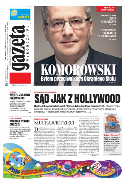 „Byłem przeciwnikiem Okrągłego Stołu” – Bronisław Komorowski; „Himalaista to nie bohater” – Piotr Pustelnik; sąd jak z Hollywood – będzie jak w amerykańskich filmach, tylko bez ławy przysięgłych – obrona może pokazać własne dowody na niewinność, prokurator nie milczy, tylko przepytuje świadków, a sędzia jest arbitrem w tym pojedynku; Turcja, więcej zakazów islamskich – turecka gospodarka kwitnie, ale kraj się islamizuje – zakazano sprzedaży alkoholu po zmroku, a stewardesy nie mogą malować ust na czerwono; wakacje pewno droższe – kurs złotego mocno poleciał w dół i wakacyjne wojaże będą droższe – w najbliższych tygodniach złotemu trudno będzie się umocnić; Jana Brzechwy życie niebajkowe.