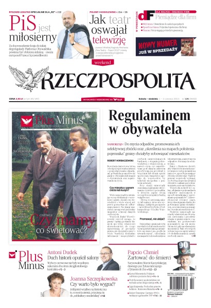 Regulaminem w obywatela – do mycia odpadów, promowania ich selektywnej zbiórki oraz „określenia na mapach położenia pojemnika” gminy chciałyby zobowiązać mieszkańców; PiS jest miłosierny – za doprowadzenie kraju do takiej degrengolady Platforma Obywatelska powinna być obłożona infamią – uważa europoseł Prawa i Sprawiedliwości; jak teatr oswajał telewizję – laureaci Wielkiej Nagrody Festiwalu „Dwa Teatry – Sopot 2013” mówią o swojej aktorskiej przygodzie przed kamerami tv; „Polakom odebrano poczucie dumy” – Kornel Morawiecki; „Duch historii opuścił salony” – Antoni Dudek – wybory czerwcowe nie były wspólnym sukcesem obu stron okrągłostołowego kontraktu.