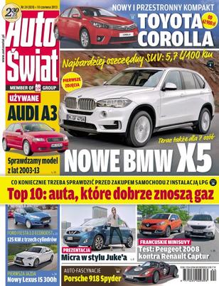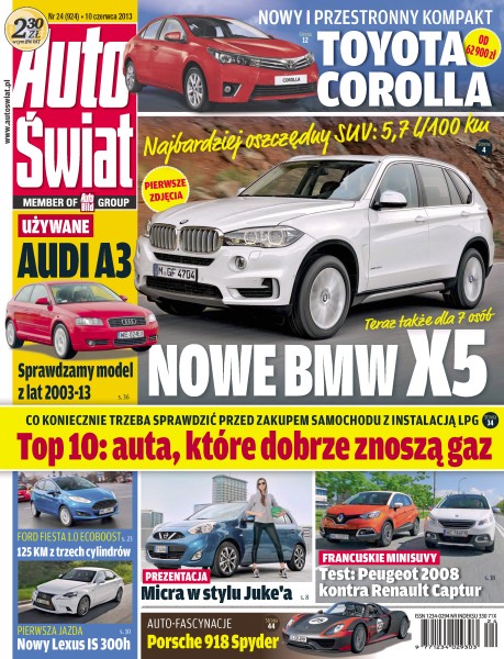Nowe BMW X5, teraz także dla 7 osób – najbardziej oszczędny SUV – nowe BMW X5 po raz pierwszy będzie miało w ofercie 4-cylindrowy silnik i napęd tylko na tylne koła; Audi A3 – sprawdzamy model z lat 2003-13; top 10, auta, które dobrze znoszą gaz – co koniecznie trzeba sprawdzić przed zakupem samochodu z instalacją LPG; Toyota Corolla – nowy i przestronny kompakt; Ford Fiesta 1.0 Ecoboost – 125 KM z trzech cylindrów; nowy Lexus IS 300h; Micra w stylu Juke'a – Micra zmienia „twarz” i nabiera lifestylowego charakteru – mały Nissan po zmianach dostępny będzie po wakacjach; francuskie minisuvy – test, Peugeot 2008 kontra Renault Captur; auto-fascynacje – Porsche 918 Spyder; Citroen DS3 Cabrio – stylowa jazda pod gołym niebem.