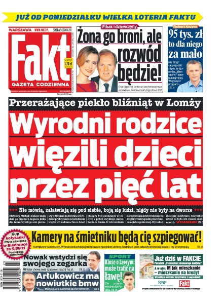 Przerażające piekło bliźniąt w Łomży – wyrodni rodzice więzili dzieci przez pięć lat; Fibak i dziewczyny – żona go broni, ale rozwód będzie; Robert Kozyra nie mógł się pogodzić z tym, że z jurorów „Mam talent!” zarabia najmniej; kamery na śmietniku będą cię szpiegować; Nowak wstydzi się swojego zegarka; Arłukowicz ma nowiutkie BMW.