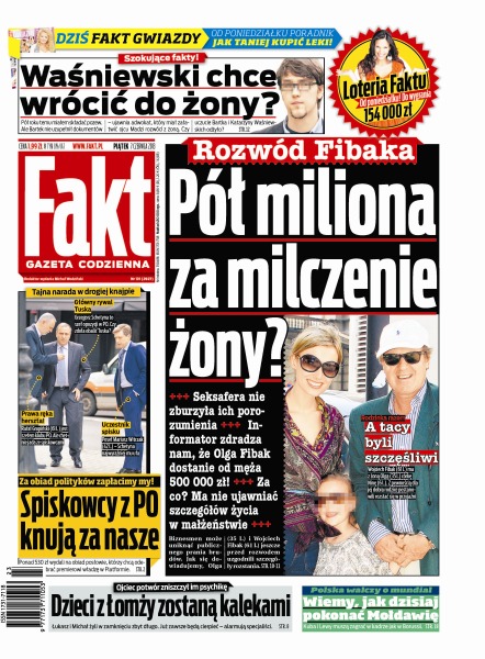 Rozwód Fibaka – pół miliona za milczenie żony; spiskowcy z PO knują za nasze – tajna narada w drogiej knajpie; ojciec potwór zniszczył im psychikę – dzieci z Łomży zostaną kalekami; Polska walczy o mundial – wiemy, jak dzisiaj pokonać Mołdawię; czy Waśniewski chce wrócić do żony.