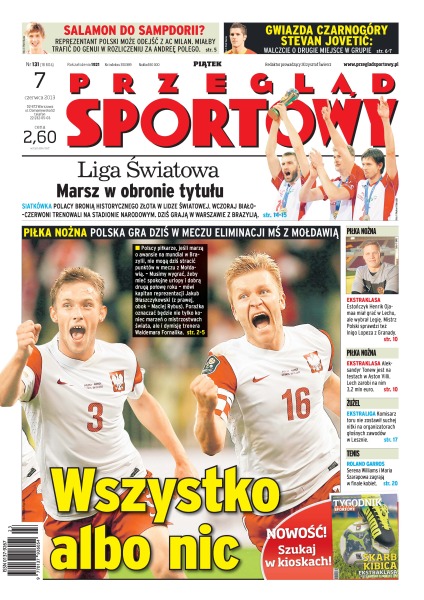 Polscy piłkarze, jeśli marzą o awansie na mundial w Brazylii, nie mogą dziś stracić punktów w meczu z Mołdawią; Estończyk Henrik Ojamaa miał grać w Lechu, ale wybrał Legię; Aleksandyr Tonew jest na testach w Aston Villi, Lech zarobi na nim 3,2 mln euro; komisarz toru nie zostawił suchej nitki na organizatorach głośnych zawodów w Lesznie; Roland Garros – Serena Williams i Maria Szarapowa zagrają w finale kobiet.