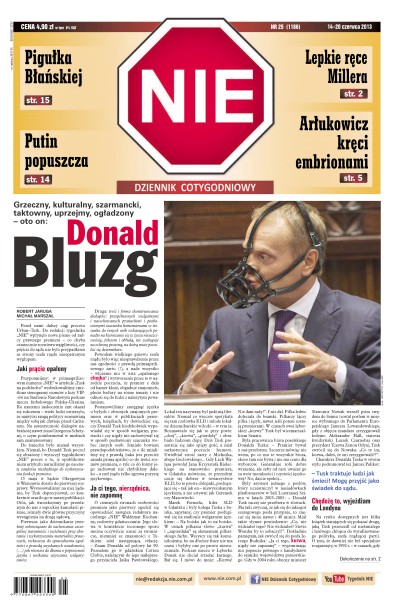Donald Bluzg – grzeczny, kulturalny, szarmancki, taktowny, uprzejmy, ogładzony – oto on; lepkie ręce Millera – Pod przewodem szorstkiego przyjaciela Leszka Millera dwa miesiące temu odbyło się ściśle tajne spotkanie grupy sympatyków gen. Wojciecha Jaruzelskiego; Arłukowicz kręci embrionami – wielkim wygranym konkursu na świadczenie zabiegów in vitro za publiczne pieniądze i głównym beneficjentem została Grupa Medicover; Putin popuszcza – 5 czerwca przy małym stoliku dostawionym do wielkiego biurka prezydenta Rosji usiedli Władimir Putin i mer Moskwy Sergiej Sobianin – ten drugi złożył na prezydenckie ręce, a Putin ją przyjął, rezygnację ze stanowiska mera rosyjskiej stolicy; separatka separata urogaca – dogorywa katolicki wynalazek ewangelika Buzka.