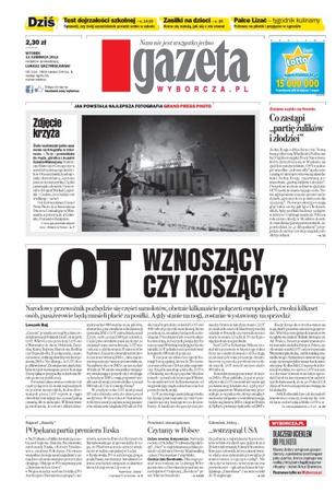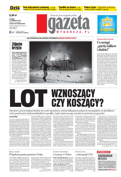 Narodowy przewoźnik pozbędzie się części samolotów, obetnie kilkanaście połączeń europejskich, zwolni kilkaset osób, pasażerowie będą musieli płacić za posiłki, a gdy stanie na nogi, zostanie wystawiony na sprzedaż; terenowe badania nad Platformą; im większe miasto, tym większa burza – twierdzą naukowcy z Uniwersytetu Princeton w USA, a Japończycy prognozują, kogo w najbliższym stuleciu zaleje; za jednym z największych przecieków w historii służb specjalnych stoi 29-letni Edward Snowden; test dojrzałości szkolnej; po skandalu wokół memorandum z Gazpromem minister skarbu Włodzimierz Karpiński postanowił zwiększyć nadzór nad PGNiG i PGE; gdzie szukać pomocy, kiedy nie mamy pracy, chorujemy i nie starcza nam na utrzymanie dzieci; Piotr Małachowski poprawił rekord Polski o ponad dwa metry, ale rekordu świata raczej nigdy nie pobije – kiedy enerdowcy rzucali ponad 74 m, ich lekarze czynili cuda – żartuje polski dyskobol.