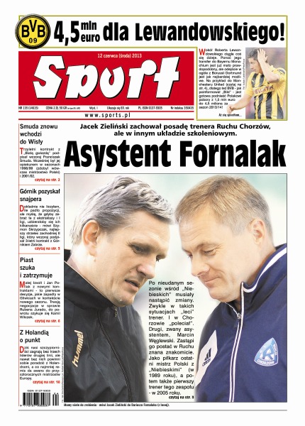 Jacek Zieliński zachował posadę trenera Ruchu Chorzów, ale w innym układzie szkoleniowym; trzyletni kontrakt z „Białą gwiazdą” podpisał wczoraj Franciszek Smuda; Paulina Pawlak nadal będzie rozgrywającą wicemistrzyń Polski – kontrakty podpisały również Erin Phillips oraz Jantel Lavender; Ekstraliga poszła śladem koszykówki i siatkówki, więc będą w niej obowiązywały standardy światowe; Urszula Radwańska szybko pożegnała Birmingham, a Jerzy Janowicz i Łukasz Kubot Halle; brązowy medalista olimpijski znów dźwiga i chce wystartować w październikowych mistrzostwach świata w Polsce.
