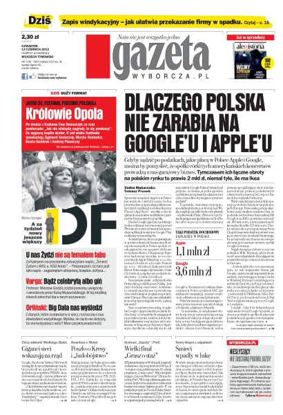 Dlaczego Polska nie zarabia na Google'u i Apple'u; kolejny problem z ustawą śmieciową – zaczyna się czas, w którym stare firmy już nie chcą odbierać od ludzi odpadów, a nowe zaczną to robić dopiero po 1 lipca; internetowi giganci naciskają na amerykański rząd, by ujawnił szczegóły programu totalnej inwigilacji PRISM; jak przekazać firmę, ale bez sporu o spadek; czeski kolejowy przewoźnik pasażerski LEO Express już od grudnia chce wjechać na polskie tory; rząd zaparł się z VAT od aut z kratką; po znakomitym meczu San Antonio Spurs i beznadziejnej grze Miami Heat w finale NBA jest 2-1; czy jeśli Real Madryt nie zdoła przejąć wymarzonego Carlo Ancelottiego, to znów czekają go lata nieustających przewrotów pałacowych.