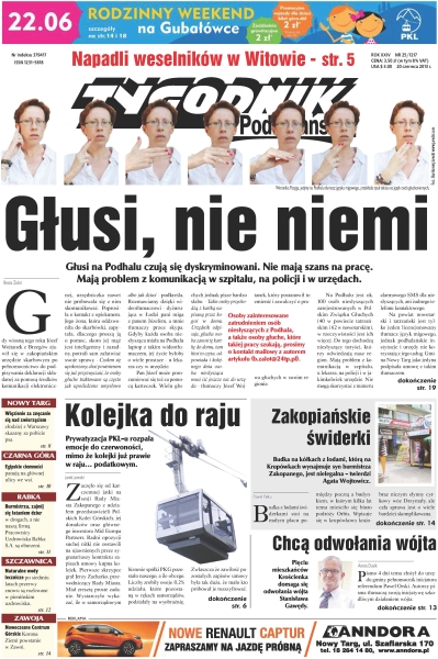 Głusi na Podhalu czują się dyskryminowani – nie mają szans na pracą, mają za to problemy z komunikacją w urzędach; prywatyzacja PKL-u rozpala emocje do czerwoności; napadnięto weselników w Witowie; pięciu mieszkańców Krościenka domaga się odwołania wójta Stanisława Gawędy; czy budka na kółkach z lodami, którą na Krupówkach wynajmuje syn burmistrza Zakopanego jest nielegalna.