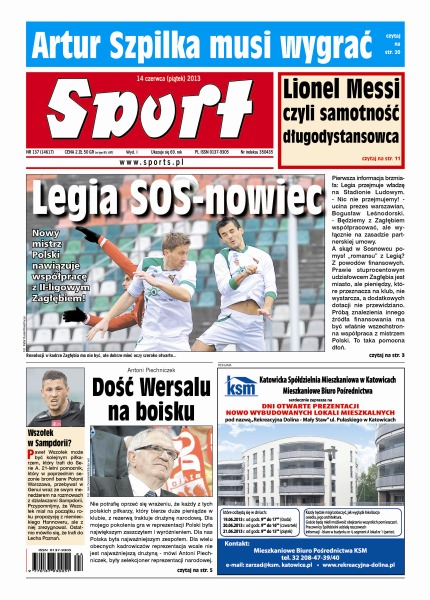 Nowy mistrz Polski nawiązuje współpracę z II-ligowym Zagłębiem; Jarosław Kołodziejczyk szefuje klubowi ledwie pół roku, ale to wystarczyło, by stał się jednym z najbardziej rozpoznawalnych prezesów w elicie; Antoni Piechniczek jest przekonany, że dla wielu obecnych kadrowiczów reprezentacja Polski nie jest najważniejszą drużyną; Hiszpania i Brazylia to główni faworyci Pucharu Konfederacji – oba zespoły traktują turniej jako rekonesans, bo to co najważniejsze odbędzie się na brazylijskich stadionach za rok; Lionel Messi po raz trzeci został najlepszym strzelcem lig europejskich, ale nie poprawił swojego rekordu; po otrzymaniu licencji na grę w ekstraklasie, ROW Basket Rybnik w dość szybkim tempie