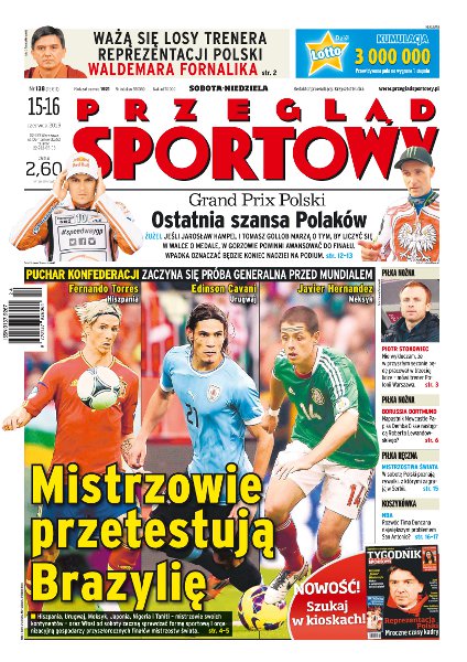 Rozpoczyna się Puchar Konfederacji, próba generalna przed przyszłorocznym mundialem; ważą się losy trenera reprezentacji Polski; Grand Prix Polski na żużlu – ostatnia szansa Polaków; rozmowa z Piotrem Stokowcem, trenerem Polonii Warszawa; czy napastnik Newcastle Papiss Demba Cisse będzie następcą Roberta Lewandowskiego w Borussi Dortmund; w sobotę piłkarki ręczne poznają rywalki, z którymi zagrają na mistrzostwach świata; memoriał Janusza Kusocińskiego.