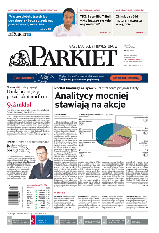Największy w Polsce newsroom gospodarczy zbiera, analizuje i zgłębia dla Państwa najważniejsze informacje ze świata finansów. Codzienne wydanie „Parkietu”, sześć dni w tygodniu, to kilkadziesiąt artykułów o emitentach, instytucjach finansowych, gospodarce. To również opinie, felietony i wywiady z najważniejszymi ludźmi krajowej i globalnej finansjery.