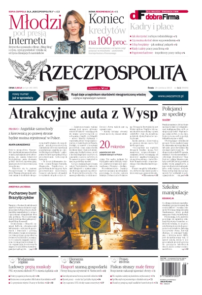 Angielskie samochody z kierownicą po prawej stronie będzie można rejestrować w Polsce; pracownicy Inspekcji Sanitarnej twierdzą, że MEN manipuluje danymi o gotowości szkół do przyjęcia sześciolatków; w Polsce jest zaledwie 50 tys. miejsc opieki dla maluchów; imprezy PiS w parafiach zaszkodzą Kościołowi – mówi europoseł PJN Michał Kamiński; dopiero w piątym roku prezydentury Barack Obama zdecydował się na oficjalną wizytę w stolicy Niemiec; organizacja drogich sportowych imprez wywołała irytację zmagających się z kryzysem Brazylijczyków; pamięć i inteligencję można znacznie poprawić, wykorzystując związek chemiczny opracowany przez naukowców; kto nie ma oszczędności, nie będzie mógł pożyczyć pieniędzy na mieszkanie – zakłada najnowsza rekomendacja Komisji Nadzoru Finansowego.