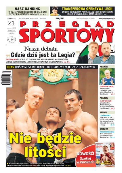 Dziś w Moskwie Krzysztof Diablo Włodarczyk walczy z Rachimem Czakijewem; ranking 15 najlepszych bokserskich walk wagi ciężkiej w ostatnich 10 latach; na testy do Legii Warszawa przyjeżdża dziś dwóch pomocników: Helio Pinto i Rafael Augusto; sprawę transferu Marcina Kowalczyka do Rosji prawdopodobnie rozstrzygnie FIFA.
