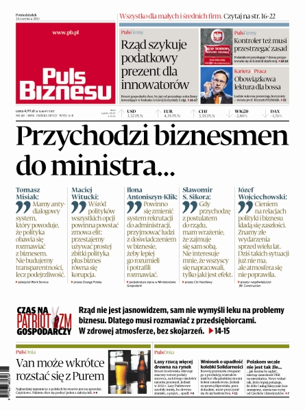 Rząd szykuje podatkowy prezent dla innowatorów – resort gospodarki chce, by już od przyszłego roku firmy inwestujące w badania i rozwój korzystały z ulgi; podatnikowi przysługuje 7 dni na przygotowanie się do kontroli skarbowej; rząd nie jest jasnowidzem, sam nie wymyśli leku na problemy biznesu, dlatego musi rozmawiać z przedsiębiorcami; Van może wkrótce rozstać się z Purem – najbardziej tajemniczy z polskich browar˙w jest na sprzedaż.