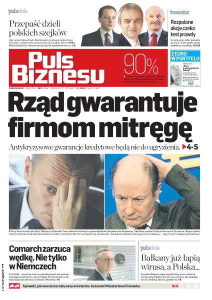 Pracodawcy krytykują rządowe zasady gwarantowania firmom kredytów bankowych, ustawa kominowa spowodowała kolosalną różnicę w zarobkach członków zarządu Lotosu i prezesów Orlenu, świńska grypa: Bułgaria boi się recesji i ogranicza wydatki, Comarch wyda 3 mln euro na marketing w krajach Europy Zachodniej, na New Connect wchodzi Microtech, sąd zamyka hutę szkła Krosno, pora ogłaszania wyników finansowych może zweryfikować ostatnie wzrosty notowań spółek.