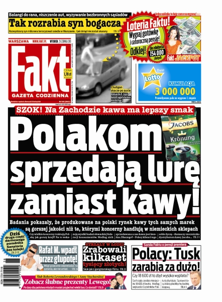 Rozwydrzony syn milionera terroryzował osiedle w Warszawie, i jak dotąd nie został ukarany; Polakom sprzedają lurę zamiast dobrej jakościowo i smacznej kawy; Rafał M. wpadł przez głupotę – mógł grzecznie odpowiadać na pytania, ale nie umiał; ślub Roberta Lewandowskiego i Anny Stachurskiej – zobacz ślubne prezenty Lewego; skok jak z gangsterskiego filmu – zrabowali kilkaset tysięcy złotych.