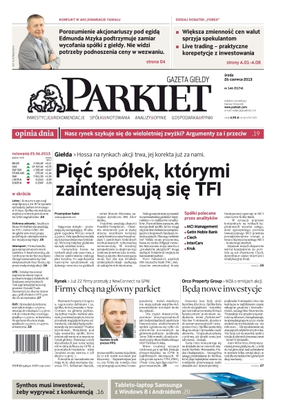 Nasz rynek szykuje się do wieloletniej zwyżki – argumenty za i przeciw; hossa na rynkach akcji trwa, jej korekta już za nami – pięć spółek, którymi zainteresują się TFI; firmy chcą na główny parkiet – już 22 firmy przeszły z NewConnect na GPW; Orco Property Group – będą nowe inwestycje; Synthos musi inwestować, żeby wygrywać z konkurencją.