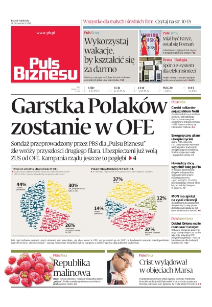 Garstka Polaków zostanie w OFE – ubezpieczeni już wolą ZUS od OFE, kampania rządu jeszcze to pogłębi; wykorzystaj wakacje, by kształcić się za darmo – na firmy czeka ponad 2,5 tys. kursów i szkoleń dotowanych przez Unię Europejską; miał być Paryż, ostał się Poznań – odzieżówka krytykuje dobór imprez w programie promocji branży; spór o e-system dla elektrośmieci – projekt ustawy o zużytym sprzęcie budzi coraz więcej emocji.