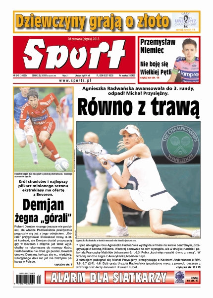 Wimbledon – Agnieszka Radwańska awansowała do 3. rundy, odpadł Michał Przysiężny; Gliwiczanie wykupili z Legii Warszawa Damiana Zbozienia i ściągnęli Krzysztofa Króla; król strzelców i najlepszy piłkarz minionego sezonu ekstraklasy ma ofertę z Beveren; nie tak dawno Paulinho „kopał się po czole”, grywając nawet w Młodej Ekstraklasie, dzisiaj jest bohaterem Brazylii; Piotr Werner, współpromotor Krzysztofa Włodarczyka, odsłania okoliczności organizacji walki w Moskwie i dlaczego może dojść do jeszcze jednej.