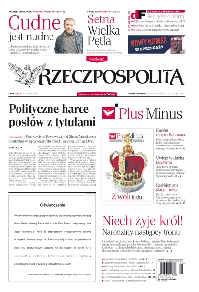 Prof. Krystyna Pawłowicz i prof. Stefan Niesiołowski dwukrotnie w tej kadencji trafili przed Sejmową Komisję Etyki.; narodziny następcy tronu – lada dzień urodzi się dziecko księcia Williama i księżnej Kate; Piotr Gontarczyk opowiada Robertowi Mazurkowi o stalinowskiej przeszłości znanego socjologa; „Bóg, honor, ojczyzna” i inne rasistowskie slogany – lewicowe strategie analizuje Stefan Sękowski; pamięć historyczna Niemców ogranicza się do winy wobec Żydów – esej Magdaleny Gawin.