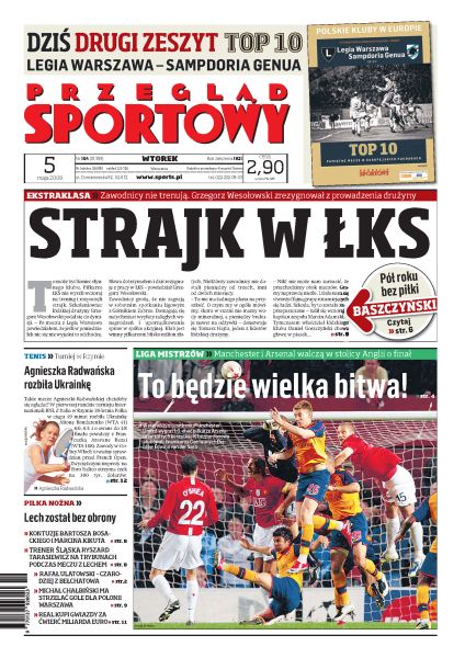 Dziś w meczu rewanżowym 1/2 finału Ligi Mistrzów Arsenal Londyn podejmie na własnym stadionie Manchester United; wywiad z Rafałem Ulatowskim, trenerem PGE GKS Bełchatów; podczas meczu Piasta z Wisłą Kraków Marcin Baszczyński doznał zerwania wiązadła krzyżowego; Agnieszka Radwańska awansowała do 2. rundy prestiżowego turnieju tenisowego w Rzymie; rozmowa z Katarzyną Skowrońską-Dolatą.