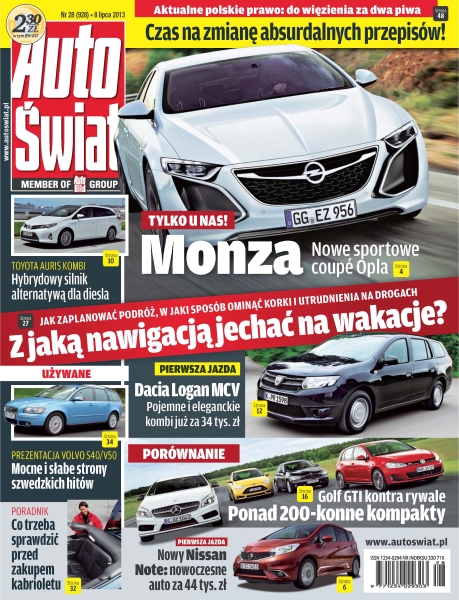 Nowości: Opel Monza, Nissan Note, Range Rover Sport, Toyota Auris TS, Dacia Logan MCV; wiadomości: Audi A8 po face liftingu, Opel Insignia Country Tourer, sprzedaż nowych aut w I półroczu 2013, crashtesty Euro NCAP: Citroen C4 Grand Picasso i Honda CR-V, Mazda 3 sedan, nasza aplikacja dla podróżujących po Europie, zwycięstwo Loeba w Pikes Peak, Porsche Mobil 1 Supercup, MotoGP – Grand Prix Holandii, niesamowity trial; testy: BMW 125i, Ford Focus ST, Mercedes A 250 Sport i VW Golf GTI, Mazda 6, Lexus GS 450h, Opel Astra GTC; porady: wyjazd na wakacje, nawigacje, gorąca linia, kupujemy auto używane – część 8; używane: Volvo S40/V50, Ford Fiesta kontra Peugeot 206+; auto-fascynacje: Rajd Pekin-Paryż.
