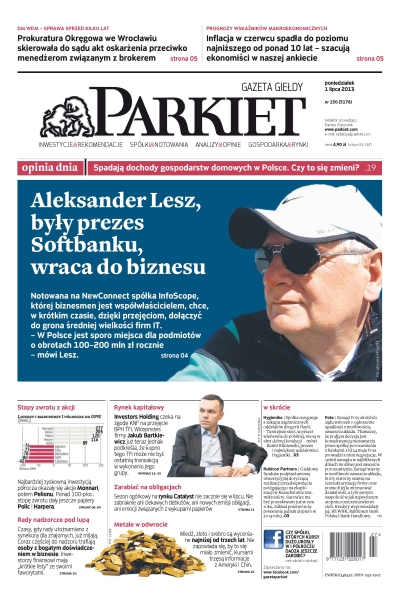 Aleksander Lesz, były prezes Softbanku, wraca do biznesu – notowana na NewConnect spółka InfoScope, której biznesmen jest współwłaścicielem, chce, w krótkim czasie, dzięki przejęciom, dołączyć do grona średniej wielkości firm IT; DM WDM, sprawa sprzed kilku lat – Prokuratura Okręgowa we Wrocławiu skierowała do sądu akt oskarżenia przeciwko menedżerom związanym z brokerem; prognozy wskaźników makroekonomicznych – inflacja w czerwcu spadła do poziomu najniższego od ponad 10 lat – szacują ekonomiści w naszej ankiecie; opinia dnia – spadają dochody gospodarstw domowych w Polsce, czy to się zmieni; metale w odwrocie – miedź, złoto i srebro są wyceniane najniżej od trzech lat – nie zapowiada się, by to się miało zmienić.