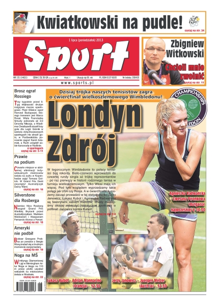 Londyn Zdrój – dzisiaj trójka naszych tenisistów zagra o ćwierćfinał wielkoszlemowego Wimbledonu – Agnieszka Radwańska - Cwetana Pironkowa najwcześniej o 14:30, Łukasz Kubot - Adrian Mannarino o 12:30, Jerzy Janowicz - Juergen Melzer o 12:30; „Chcieli mnie zwolnić” – opowiada Zbigniew Witkowski; Kwiatkowski na pudle; Brosz ograł Rossiego – trzy tygodnie przed ligą większość drużyn rozgrywa mecze sparingowe; prawie na podium – czwarte miejsce w siódmej eliminacji indywidualnych mistrzostw świata na żużlu w Kopenhadze zajął Tomasz Gollob; Silverstone dla Rosberga – Niemiec Nico Rosberg wygrał Grand Prix Wielkiej Brytanii przed Australijczykiem Markiem Webberem i Hiszpanem Fernando Alonso z Ferrari; Ameryki nie podbił – bokser Grzegorz Proksa po porażce z Sergio Morą znalazł się w trudnym momencie swojej kariery.