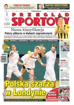 Polska szarża w Londynie – tylko deszcz może zatrzymać emocje na kortach Wimbledonu – jeśli swoje mecze wygrają dziś Jerzy Janowicz i Łukasz Kubot, będziemy pewni, że jeden z Polaków zagra w półfinale; polscy piłkarze w klubach zagranicznych, nasza klasyfikacja, 39 milionów euro, na tyle został wyceniony Robert Lewandowski w najnowszym notowaniu transfermarktu; Tour de France – Michał Kwiatkowski na podium drugiego etapu, Polak prowadzi w klasyfikacji młodzieżowców; Bartosz Bereszyński chciałby do zimy zostać w Legii i dopiero wtedy przenieść się do Benfiki; Enea Ekstraklasa – dramatyczny mecz i remis Falubazu z Unią – 18 punktów Jarosława Hampela; promotor Kalle Sauerland o „Diablo” Włodarczyku, Masternaku i walce Powietkina z Władymirem Kliczką; dziś pierwsze mecze siatkówki plażowej w Starych Jabłonkach.