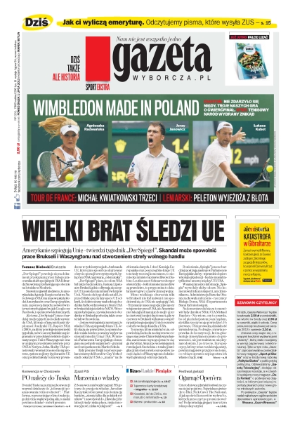 Wielki Brat śledzi UE – Amerykanie szpiegują Unię – twierdzi tygodnik „Der Spiegel” – skandal może spowolnić prace Brukseli i Waszyngtonu nad stworzeniem strefy wolnego handlu; jak ci wyliczą emeryturę – odczytujemy pisma, które wysyła ZUS; Wimbledon made in Poland – nie zdarzyło się nigdy, troje naszych gra o finał; katastrofa na Gibraltarze – zamach wymyślili Niemcy, Goebbels głosił, że Sowieci zabili generała Sikorskiego za zgodą Brytyjczyków, bo poprosił Czerwony Krzyż o pomoc w wyjaśnieniu mordu w Katyniu; PO należy do Tuska, konwencja w Chorzowie – Donald Tusk na partyjnej konwencji wzywał działaczy do „tolerancji i poszanowania różnorodności”; ogarnąć Open’era – czterodniowy gdyński festiwal zaczyna się już pojutrze – największe gwiazdy to Blur, Nick Cave i The National.