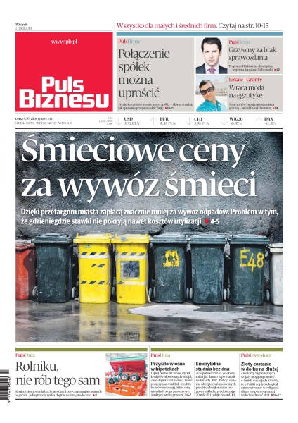 Śmieciowe ceny za wywóz śmieci – dzięki przetargom miasta zapłacą znacznie mniej za wywóz odpadów – problem w tym, że gdzieniegdzie stawki nie pokryją nawet kosztów utylizacji; rolniku, nie rób tego sam – koniec rejestrowania bez homologacji przyczep zmajstrowanych w garażu – jedną trzecią rynku chętnie wezmą producenci; połączenie spółek można uprościć – przejęcie czy utworzenie nowej spółki — eksperci radzą, jak sprawnie przeprowadzić fuzję; grzywny za brak sprawozdania – to pomysł fiskusa na dyscyplinę; wraca moda na egzotykę – Polacy znów kupują mieszkania za granicą; przyszła wiosna w hipotekach – lepiej późno niż wcale, rynek kredytów hipotecznych odtajał, choć dopiero w kwietniu; złoty zostanie w dołku na dłużej – amatorzy zagranicznych wojaży mogą zapomnieć o tanich wakacjach.