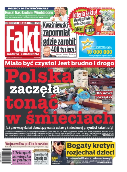 Polska zaczęła tonąć w śmieciach – miało być czysto, jest brudno i drogo – już pierwszy dzień obowiązywania ustawy śmieciowej przyniósł katastrofę; Aleksander Kwaśniewski zapomniał gdzie zarobił 400 tysięcy złotych – tajemnica zeznania podatkowego byłego prezydenta; nasi królami Wimbledonu – Polacy w ćwierćfinale; bogaty kretyn rozjechał dzieci – w tłum wjechał Morten N., milioner z Norwegii; Cichopek zamieszka w pałacu – koniec dziadowania; Kaczyński czy Tusk, kogo się bać – publicyści oceniają liderów partii; wojna wdów po Ciechowskim – matka trójki dzieci zmarłego muzyka atakuje Małgorzatę Potocką.