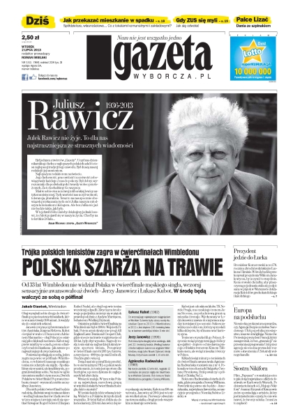 Polska szarża na trawie – od 33 lat Wimbledon nie widział Polaka w ćwierćfinale męskiego singla, wczoraj sensacyjnie awansowało aż dwóch – Jerzy Janowicz i Łukasz Kubot – w środę będą walczyć ze sobą o półfinał; Juliusz Rawicz nie żyje – to dla nas najstraszniejsza ze strasznych wiadomości; jak przekazać mieszkanie w spadku – spółdzielcze, własnościowe... co z lokalami komunalnymi i zakładowymi; gdy ZUS się myli, jak się odwołać; prezydent jedzie do Łucka – Bronisław Komorowski uczci 70. rocznicę zbrodni wołyńskiej w Łucku na Ukrainie; Europa na podsłuchu – niemiecka prokuratura sprawdza, czy Agencja Bezpieczeństwa Narodowego USA popełniła przestępstwo, masowo inwigilując Niemców; siostra Nikifora – film „Papusza” o romskiej poetce to jak dotąd największe odkrycie festiwalu w Karlowych Warach.