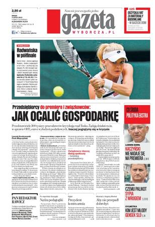 Jak ocalić gospodarkę – przedsiębiorcy do premiera i związkowców – przedstawiciele 300 tysięcy pracodawców krytykują rząd Tuska – żądają działań m.in. wsprawie OFE, euro i wyłudzeń podatkowych, inaczej pogrążymy się w kryzysie; nędza pedagogiki, po reportażu Szczygła – na reportażu o Ewie T. powinni się kształcić nauczyciele, bo pokazuje nędzę imarność pedagogiki – widzimy, jak pod przykrywką pozorów „karnego i konsekwentnego” wychowania można skazać dziecko na śmierć – dobry pedagog musi dzieci lubić; Agnieszka Radwańska w półfinale – epicki mecz – donosi agencja Reuters – Jeden z najlepszych w tym roku – zachwycają się eksperci; prezydent kontra armia – armia grozi interwencją, jeśli sytuacja w Egipcie się nie uspokoi, ale rządzący od roku prezydent Mohammed Mursi odrzuca ultimatum i zapowiada własny „plan pojednania”.