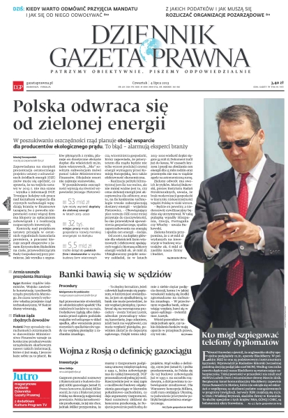 Polska odwraca się od zielonej energii – w poszukiwaniu oszczędności rząd planuje obciąć wsparcie dla producentów ekologicznego prądu; kiedy warto odmówić przyjęcia mandatu i jak się od niego odwoływać; z jakich podatków i jak muszą się rozliczać organizacje pozarządowe; kto mógł szpiegować telefony dyplomatów – Edward Snowden ujawnił, że anglosaskie służby specjalne podglądały m.in. aparaty BlackBerry – w polskim MSZ to one są podstawowym instrumentem łączności; wojna z Rosją o definicję gazociągu – Gazprom prowadzi rozmowy z Białorusinami o budowie drugiej nitki gazociągu Jamał II; banki bawią się w sędziów – sąd prawomocnie stwierdził, że odziedziczyłeś spadek? Dla niektórych banków to za mało.
