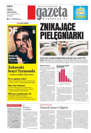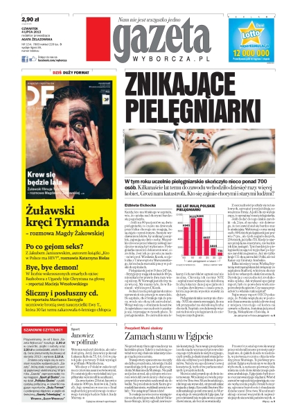 Znikające pielęgniarki – w tym roku uczelnie pielęgniarskie skończyło nieco ponad 700 osób – kilkanaście lat temu do zawodu wchodziło dziesięć razy więcej kobiet, grozi nam katastrofa, kto się zajmie chorymi i starymi ludźmi; Janowicz w półfinale – weteran walczył dzielnie, ale młodość górą – Jerzy Janowicz pokonał Łukasza Kubota 3-0 w setach i w piątek jako pierwszy Polak wystąpi w półfinale Wimbledonu; zamach stanu w Egipcie – prezydent Mursi obalony – nieprzebrany tłum zgromadzony na kairskim placu Tahrir z radością powitał wczoraj obalenie islamistycznego rządu przez armię; Bye, bye demon! – w liczbie wskrzeszonych zmarłych ojciec Bashobora z Ugandy bije Chrystusa na głowę.