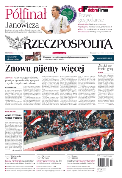 Znowu pijemy więcej – Polacy wracają do alkoholu, po którym są coraz bardziej agresywni – wynika z danych resortu zdrowia; armia przejmuje władzę w Egipcie – setki żołnierzy i czołgi przed pałacem prezydenckim w Kairze – a w środku samotny Mohamed Mursi, którego opuścili współpracownicy; „Nabici we franki” górą – łódzki Sąd Okręgowy orzekł wczoraj, że stosowane przez BRE Bank raty były zawyżane; półfinał dla Janowicza – zabójczy serwis przepustką do historii polskiego tenisa – dziś Agnieszka Radwańska walczy o finał z Sabine Lisicki; słony rachunek za państwo – ponad połowę pensji oddajemy w podatkach; stopy procentowe w dół – kredyty tańsze po decyzji RPP; kosztowni jednoręcy bandyci – czy za ustawę hazardową zapłacimy 10 mld zł.