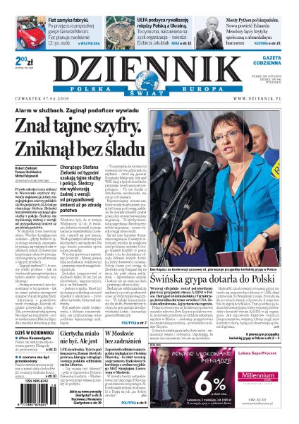 Świńska grypa dotarła do Polski, chorobę wykryto u 58-letniej mieszkanki Tarnobrzega; w niewyjaśnionych okolicznościach zaginął podoficer służb wywiadowczych; jak przebiegała wczorajsza wizyta polskiego ministra spraw zagranicznych w Moskwie; czeski Senat ratyfikował traktat reformujący Unię Europejską; prezydent Gruzji został oskarżony o próbę wprowadzenia stanu wyjątkowego; zagraniczni eksperci radzą, co Polska powinna zrobić, aby Euro 2012 przyniosło zysk.