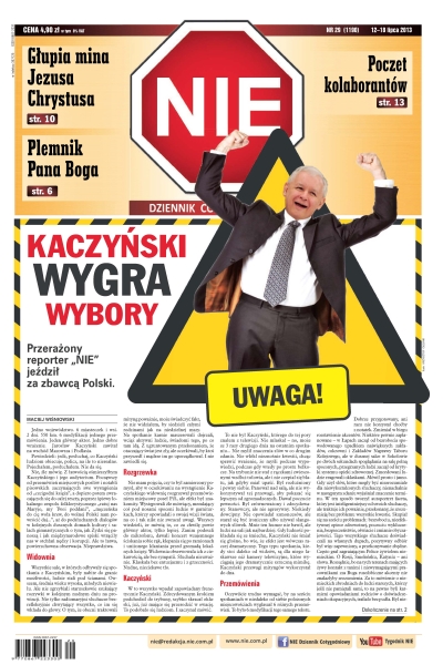 Kaczyński wygra wybory – przerażony re por ter „NIE”jeździł za zbawcą Polski; jeśli PiS dojdzie do władzy, wybuchnie wojna z Unią Europejską; reportaż o samobójstwie, czyli dlaczego lepiej skoczyć głową w dół niż nie skoczyć; Mariusz Dzierżawski, fanatyczny miłośnik stworów ludziopodobnych, znowu atakuje; fenomen made in Poland: wiernych i kapłanów ubywa, świątyń przybywa.