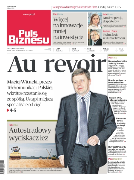 Jakie mają być unijne dotacje w nowym programie wsparcia Inteligentny Rozwój; jak banki wspierają eksporterów; informatycy z wiedzą biznesową to skarb – uważa Franciszek Szweda; Maciej Witucki, prezes Telekomunikacji Polskiej, wkrótce rozstanie się ze spółką – ustąpi miejsca specjaliście od cięć; w 2015 r. Polacy wydadzą na luksusowe towary blisko 13 mld zł, niemal o 30 proc. więcej niż w 2012 r. – szacuje KPMG; dlaczego nowa wersja ustawy autorstwa PSL nie satysfakcjonuje producentów żywności; resort gospodarki chce ulżyć hutom i innym energochłonnym zakładom – proponuje dopłaty z funduszu, który rząd gromadzi, sprzedając nadwyżki
