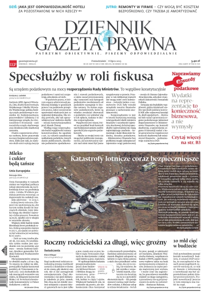 Jaka jest odpowiedzialność hoteli za pozostawione w nich rzeczy; specsłużby w roli fiskusa – są urzędem podatkowym na mocy rozporządzenia Rady Ministrów; choć wygląd boeinga 777 południowokoreańskich linii lotniczych Asian Airlines, który rozbił się w sobotę na lotnisku w San Francisco, budzi przerażenie, większość pasażerów uszła z życiem; Unia Europejska w ramach zmian we wspólnej polityce rolnej zdecydowała się na likwidację kwot na produkcję cukru i mleka; dziś powinniśmy poznać kształt nowelizacji budżetu; rząd zaoferował rodzicom rewolucyjną zmianę: możliwość zostania z dzieckiem w domu aż do czasu, gdy skończy ono rok.