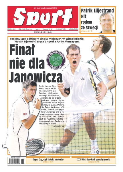Finał nie dla Janowicza – pasjonujące półfinały singla mężczyzn w Wimbledonie – Novak Djoković zagra o tytuł z Andy Murrayem; Patrik Liljestrand – hit rodem ze Szwecji – nowy szkoleniowiec NMC Zabrze – 21 lat temu w Barcelonie srebrny medalista olimpijski z reprezentacją „Trzech koron”; Deyna Cup, czyli batalia mistrzów – pierwsza edycja Generali Deyna Cup będzie zaraz ostatnim sprawdzianem Legii Warszawa przed startem w kwalifikacjach Champions League; CCC i Wisła Can-Pack poznały rywalki; labirynt, życie po kadrze – funkcja selekcjonera drużyny narodowej to dla każdego trenera najwyższy honor i prestiż – ma tylko jedną wadę, zbyt często wysadza w powietrze przebyte wcześniej mosty.
