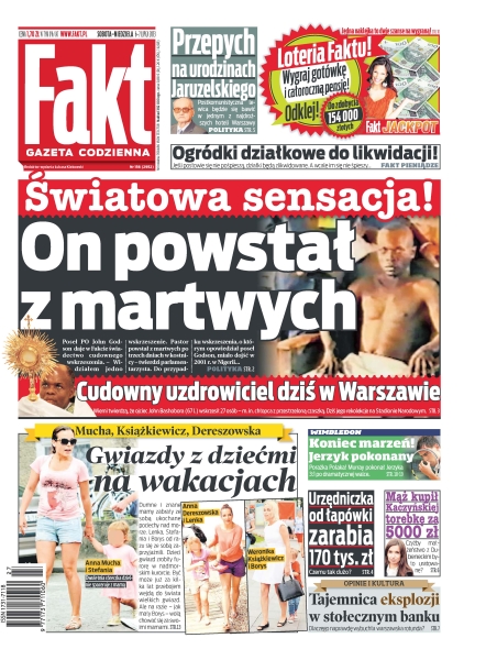 Światowa sensacja, on powstał z martwych – poseł PO John Godson daje w Fakcie świadectwo cudownego wskrzeszenia; cudowny uzdrowiciel dziś w Warszawie – wierni twierdzą, że ojciec John Bashobora wskrzesił 27 osób – m. in. chłopca z przestrzeloną czaszką; koniec marzeń, Jerzyk pokonany – porażka Polaka, Murray pokonał Jerzyka 3:1 po dramatycznej walce; gwiazdy z dziećmi na wakacjach – dumne i znane mamy zabrały ze sobą ukochane pociechy nad morze; urzędniczka od łapówki zarabia 170 tys. zł – czemu tak dużo; mąż kupił Marcie Kaczyńskiej torebkę za 5000 złotych – czyżby małżeństwo z Dubienieckim było uratowane; tajemnica eksplozji w stołecznym banku – dlaczego naprawdę wybuchła warszawska rotunda.