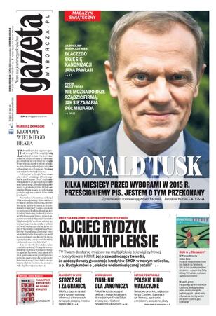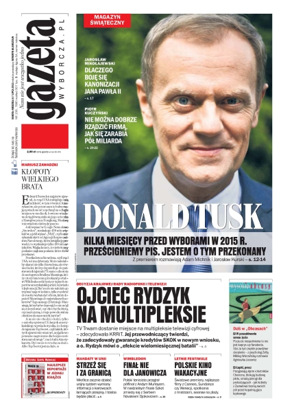 „Kilka miesięcy przed wyborami w 2015 roku prześcigniemy PiS. Jestem o tym przekonany” – Donald Tusk w rozmowie z Adamem Michnikiem i Jarosławem Kurskim; dlaczego boję się kanonizacji Jana Pawła II – Jarosław Mikołajewski; nie można dobrze rządzić firmą, jak się zarabia pół miliarda – Piotr Kuczyński; ojciec Rydzyk na multipleksie – TV Trwam dostanie miejsce na multipleksie telewizji cyfrowej – zdecydowała KRRiT; mandaty w Unii, strzeż się za granicą – wkrótce zacznie działać unijny system wymiany informacji o kierowcach łamiących przepisy; finał Wimbledonu nie dla Janowicza – polski tenisista przegrał półfinał z Andym Murrayem; polskie kino wakacyjne – światowe premiery, najlepsze filmy z Cannes, Sundance czy Wenecji, spotkania z mistrzami, seanse na plaży.
