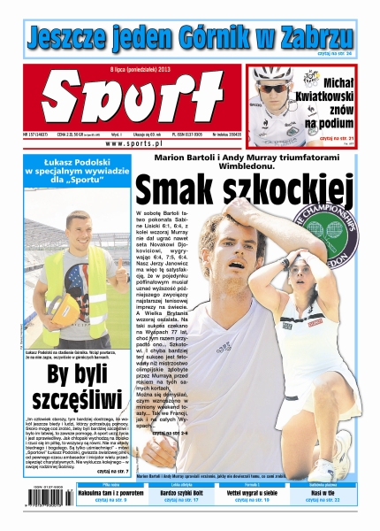 Andy Murray pokonał Novaka Djokovicia i po 77 latach tytuł mistrza Wimbledonu powrócił do Albionu; po mizernym finale Francuzka Marion Bartoli została mistrzynią – pogromczyni Sereny Williams i Agnieszki Radwańskiej, faworyzowana Sabine Lisicki, zalała się łzami; mecz Jerzego Janowicza z Łukaszem Kubotem był porywający, a to, co wydarzyło się na korcie później, było wielką promocją Polski; Mistrzowie Polski wygrali pierwszą edycję Generali Deyna Cup; podczas dziewiątego mityngu Diamentowej Ligi Usain Bolt na 200 metrów i trójka innych biegaczy uzyskali najlepsze wyniki w tym roku na świecie; „Kajto” wygrał jedenaście z dwunastu odcinków specjalnych Rajdu Karkonoskiego; Sebastian Vettel po raz pierwszy wygrał Grand Prix Niemiec, odczarowując dotąd pechowy dla siebie lipiec.